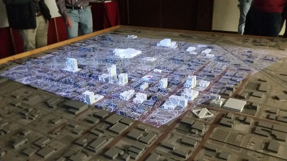 .This project revolves around the collective behavior of diverse agents within an urban environment. It was initiated using the Processing programming tool, which is renowned for its open-source graphical library. Subsequently, this concept was projected into a physical model representing Lubbock city, where the spontaneous actions of autonomous agents predominantly originate from key focal points, particularly buildings.