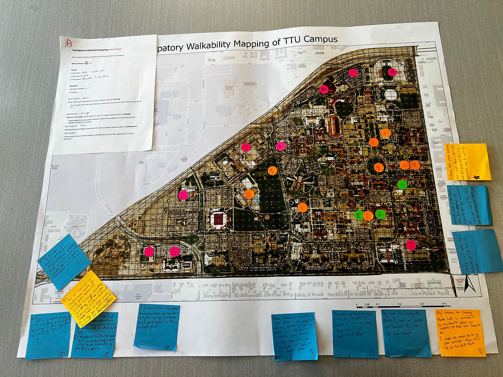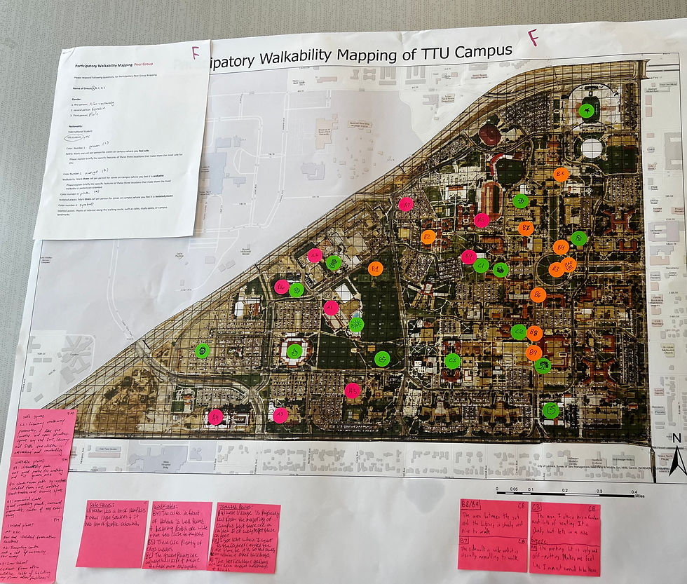 In this section, I showcase my community engagement and participatory mapping projects. These include a campus walkability study with Texas Tech University students, where participants documented their walking experiences through digital and manual mapping, and the Social Mapcrafta workshop with Harmony Science Academy middle school students, where youth explored their neighborhoods through creative mapping and storytelling.